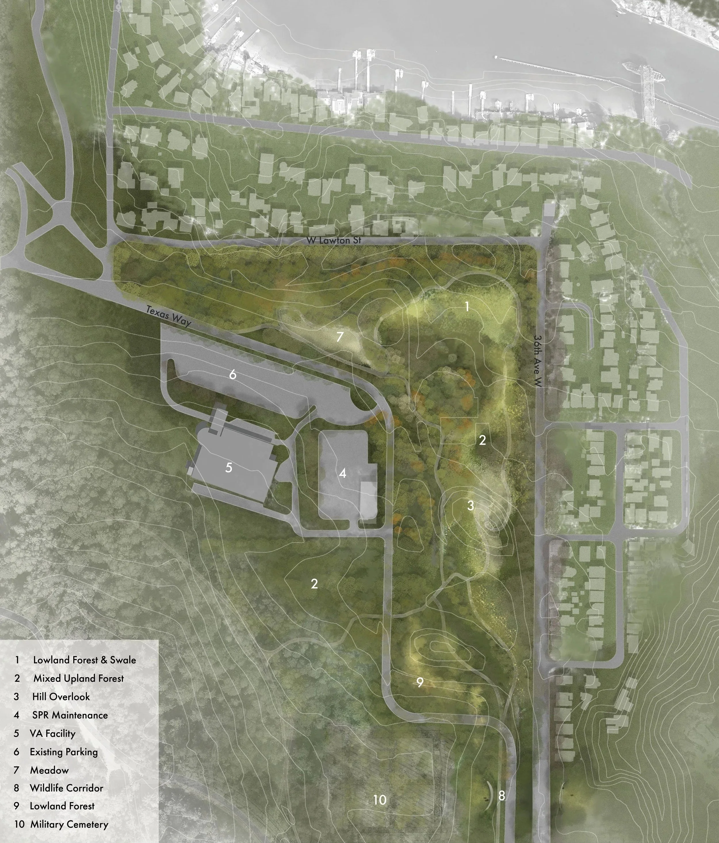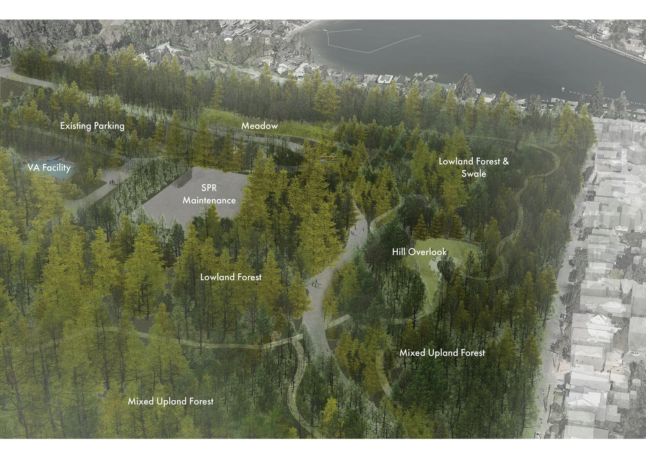 Developed by MxM together with Charles Anderson, the plan brings back 35 acres of the Pacific Northwest Forest—a forest shaped over thousands of years, supporting trees hundreds of feet tall. This is an environment for all kinds of life to flourish, including people. The site formerly housed Army facilities which are no longer needed. The shared vision aims to return this land to the public and re-imagine it as an urban wilds in the greater Discovery Park. This would be a forest, a diverse plant community, wildlife habitat, a respite, and a place to turn our eyes and hearts toward a place less built.