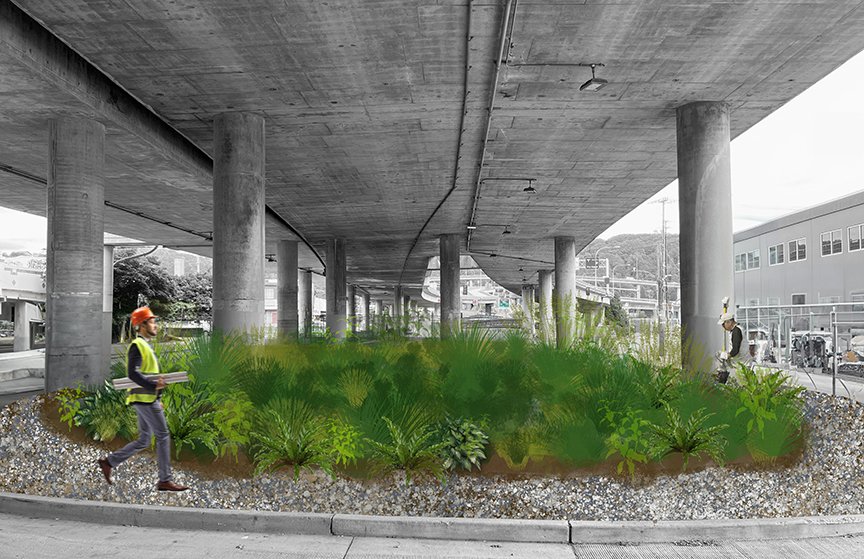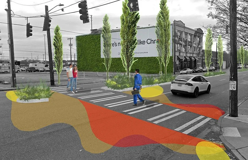 MxM helped the SODO Business Improvement Area chart a course for the neighborhood’s greener future. Through a series of task force workshops and public meetings, we developed a plan that anchors SODO’s nature-facing future around five distinct opportunities: adding new street trees, retrofitting overpasses to manage stormwater, repurposing leftover spaces, transforming S Industrial Way, and incentivizing private greening.