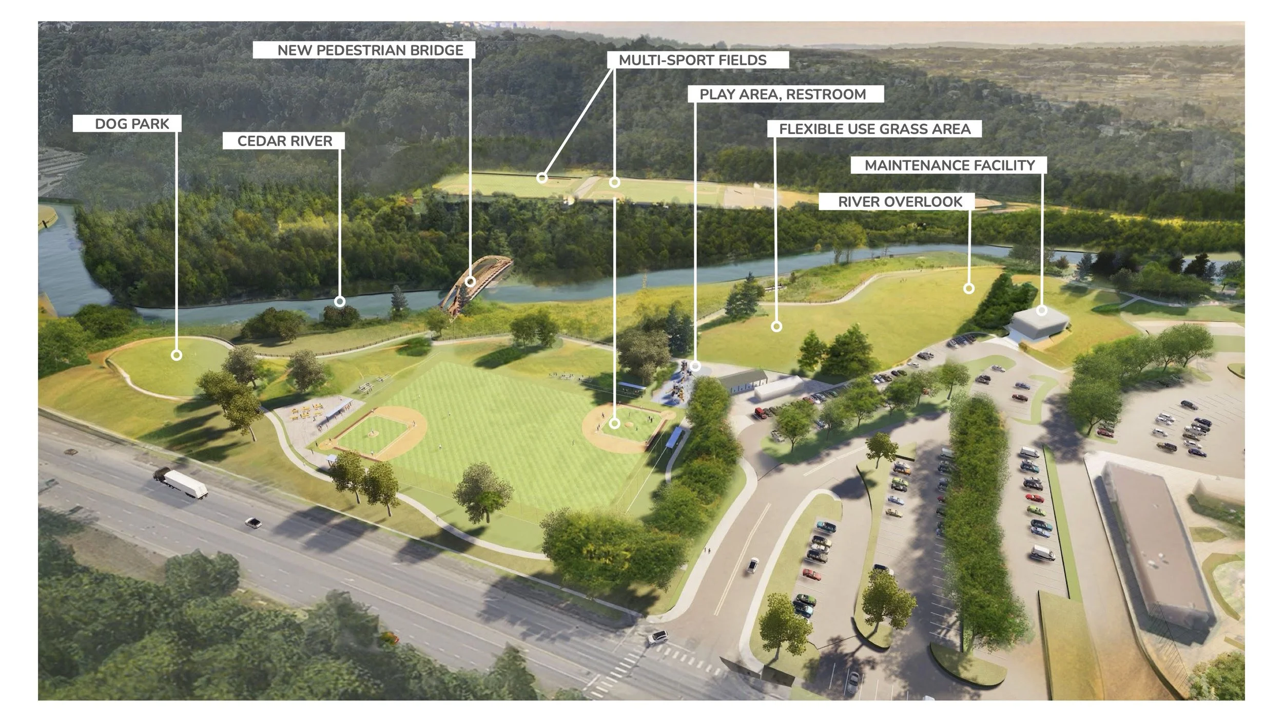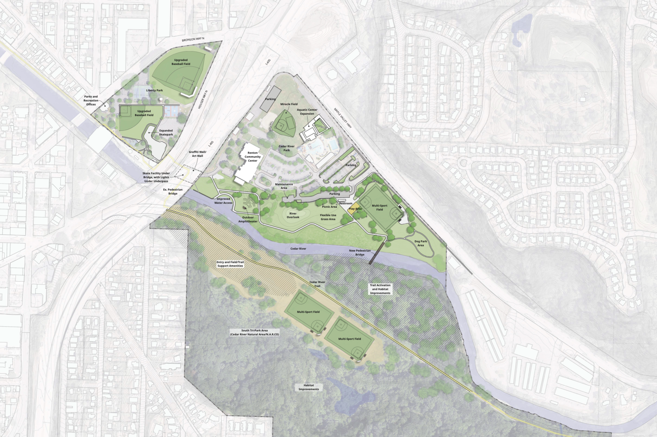 MxM was tasked with developing a comprehensive vision for Tri-Park, which is informed by extensive community engagement and designed to maximize the site’s untapped potential. The riverfront walkway enhances water access while establishing a central gathering area. A new pedestrian bridge strengthens connections between the parcels and serves as an iconic focal point. Also, new multi-sport fields are complemented by enhanced existing facilities to better meet the evolving needs of the community. This effort was conducted in conjunction with the PROS plan spearheaded by BERK.
